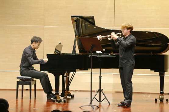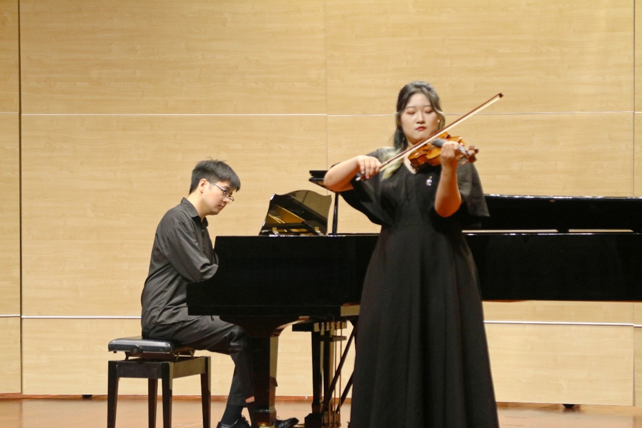 颁奖典礼结束后,获奖学生为在场观众带来了一场精彩纷呈的音乐会。音乐会在优美与深情的《楚颂》中拉开帷幕,将观众带领到音乐盛宴中;随后,钢琴独奏《弄臣》以华丽的技巧带领观众领略了浪漫主义时期的音乐特色,演奏者娴熟的指法和细腻的情感表达令人赞叹不已。小提琴独奏《引子与回旋随想曲》以其优雅的旋律和复杂的技术要求展示了演奏者的精湛技艺;声乐独唱《不答应也得答应》则通过饱满的情感表达和扎实的唱功征服了全场观众;小号独奏《小号协奏曲》以明亮激昂的音色将音乐会推向一个小高潮,赢得阵阵热烈掌声;钢琴独奏《焰火》展现了演奏者高超的指尖技巧和音乐表现力;声乐独唱《多谢朋友们》传递出深厚的情感力量;中提琴独奏《天鹅转子》和笙独奏《虹》则展现了中国传统乐器与西洋乐器的不同风采,体现了艺术学院音乐专业的多元化培养理念。最终,音乐会在具有浓郁民间腔调的声乐独唱《摇三摆》中圆满落下帷幕。