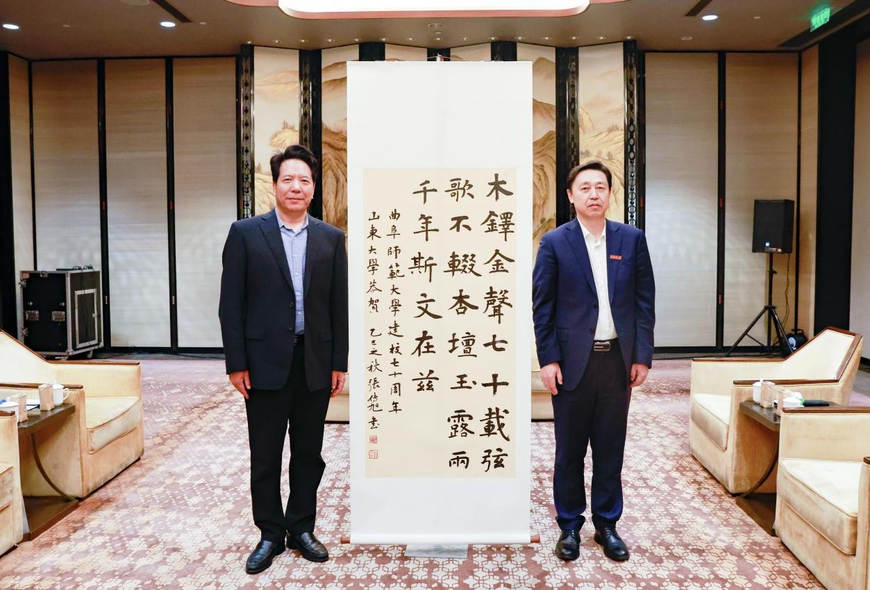 10月17日,曲阜师范大学建校70周年校庆系列活动之山东大学书法作品捐赠仪式隆重举行。山东大学党委常委、副校长曹现强,曲阜师范大学党委副书记、校长张洪海出席仪式,山东大学艺术学院以书法艺术为纽带,传递两校深厚情谊,共庆曲阜师大七秩荣光。
