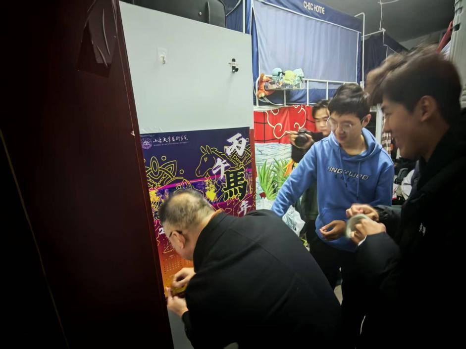 走访过程中,学院师生细致检查了宿舍卫生与安全状况,并与在宿舍的同学们进行了深入交流。学院党委副书记李勇老师重点强调了宿舍用电安全规范,提醒同学们切勿私乱接电线、使用违规电器等行为,并就消防安全知识等宿舍安全要点作了细致讲解。辅导员逄清源老师、孙雅茹老师与同学们一同张贴年历,检查卫生情况,排除安全隐患,并强调宿舍安全的注意事项。同学们认真听取,积极互动,现场气氛热烈融洽。