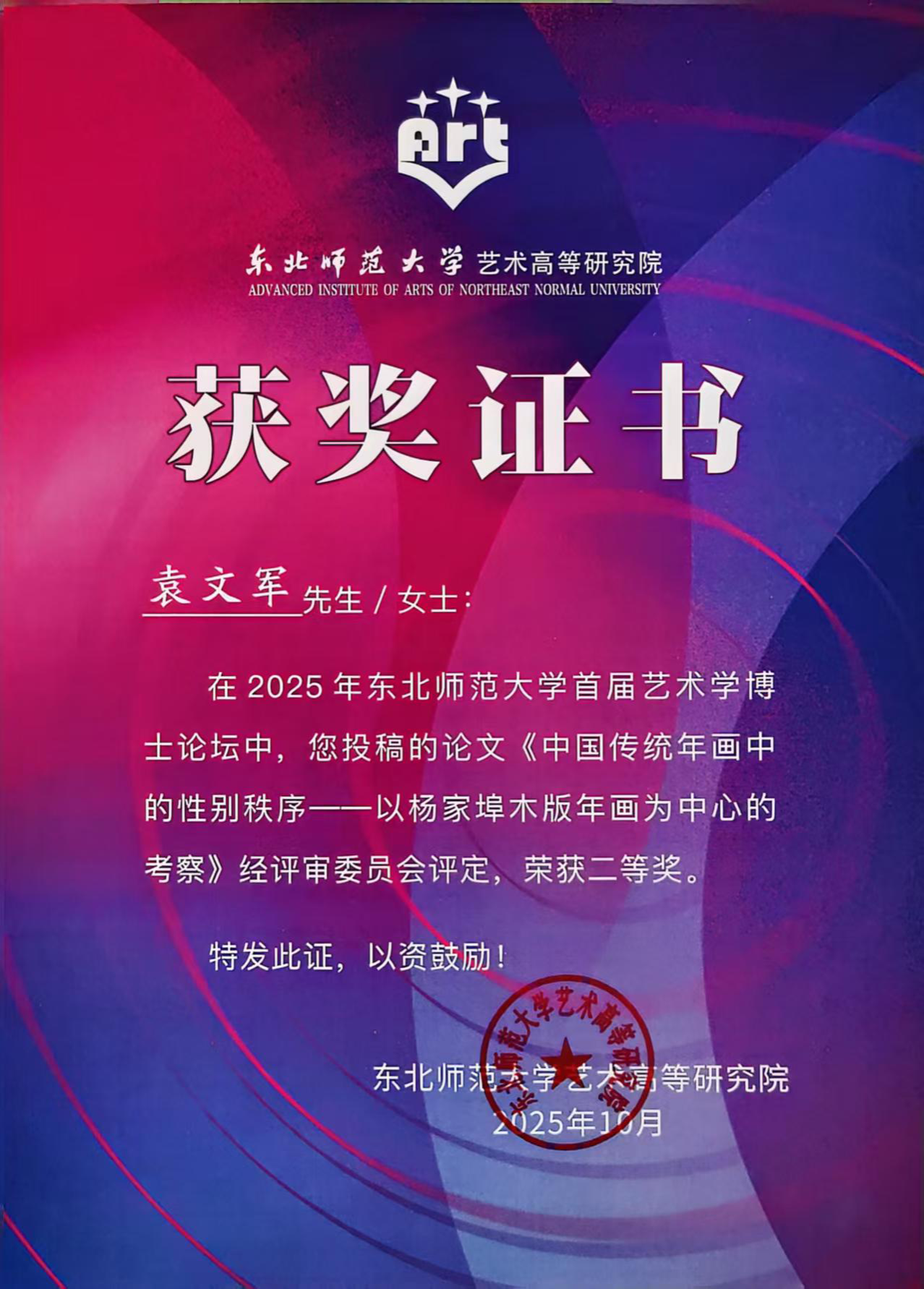 2025年10月17日至19日,东北师范大学首届艺术学博士论坛暨“AIGC背景下的艺术学前沿探索与时代回应”学术会议在长春成功举办。本届论坛由东北师范大学主办,东北师范大学高等研究院承办,《现代传播》《文艺争鸣》《民族艺术研究》《东北师大学报(哲学社会科学版)》等期刊提供学术支持。论坛汇聚了来自北京大学、山东大学、浙江大学、吉林大学、中央民族大学、中央美术学院等40余所国内外高校的专家学者及青年博士生齐聚一堂,共同探讨人工智能生成内容(AIGC)背景下艺术学发展的新趋势、新挑战与新路径。在论坛论文评选环节,山东大学艺术学院博士研究生袁文军提交的论文《中国传统年画中的性别秩序——以杨家埠木版年画为中心的考察》经过严格评审,从近300篇投稿中脱颖而出,荣获二等奖。该论文以国家级非物质文化遗产——杨家埠木版年画为研究对象,综合运用图像分析与文献考证方法,深入揭示了传统年画图像系统中所蕴含的性别角色建构、权力关系及其文化逻辑,展现了扎实的学术功底与敏锐的问题意识。