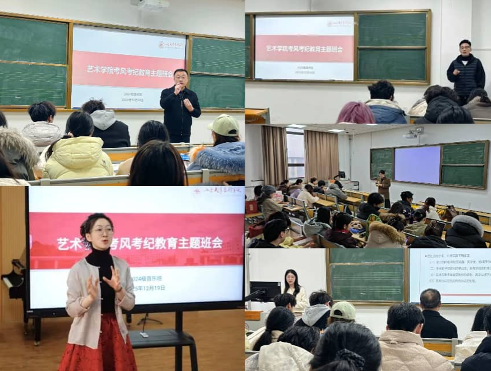 艺术学院高度重视考风考纪教育工作,将其作为学风建设与立德树人的重要环节狠抓落实。各年级、各专业班级在学院统一部署下,于考前集中召开“诚信应考”主题班会,实现教育对象全覆盖。学院党委副书记李勇老师带队,辅导员逢清源、孙雅茹,班主任牛健、韩璐、谷新春等老师深入各班级,结合艺术专业学习特点,围绕考试纪律、学术规范与诚信人格养成进行深刻解读。班会重点剖析《山东大学学生违纪处分办法(试行)》相关条款,并辅以典型案例警示教育,引导学生牢固树立纪律红线意识。同时,老师们还就科学备考、心理调适等给予指导,帮助学生以积极健康的心态迎接考试。