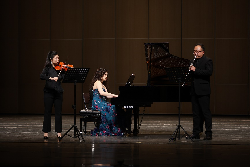 歌剧选段环节,男高音李毅以俄式浪漫演绎柴可夫斯基《叶甫盖尼·奥涅金》选段,低男中音李鳌则以法式戏剧张力呈现古诺《浮士德》选段,以不同风格的声乐艺术彰显音乐会的多元魅力。由董乐晨、夏春雨与葛之艺三位老师共同演奏的哈恰图良《三重奏》配合精妙,作品融合亚美尼亚民间元素与现代技法,第一乐章的苍凉旋律与第二乐章的热烈舞曲形成强烈对比,展现出斯拉夫音乐的独特韵味。