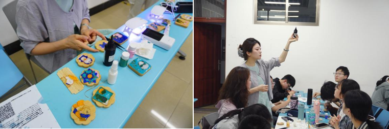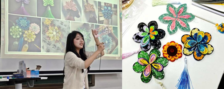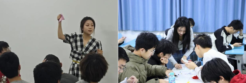 在“掐丝珐琅创作之旅”“邂逅螺钿之美,共赴指尖艺术之旅”“宋锦创作之旅”等课程中,通过对传统工艺流程的讲解与实践操作,让同学们在亲手制作中体会非遗技艺的精细结构与匠心精神,增强对传统文化的认知与尊重。“指尖衍万象,纸艺承华章”与“绳结编织”课堂以材料与形式为切入点,引导学生在反复尝试与组合中理解秩序、结构与美感的生成过程,在动手实践中获得审美体验与创造乐趣,进一步提升参与感与获得感。