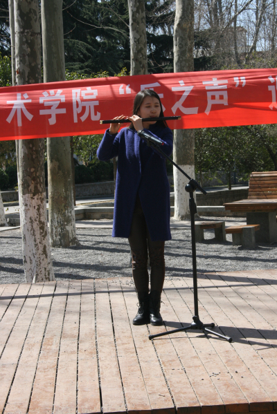 演出由一首山东韵味浓郁的笛子曲《沂河欢歌》拉开序幕,悠扬的笛声声声入耳,令人心旷神怡;接着一首二胡合奏《赛马》带动了现场气氛,寓意了甲午马年一马当先的美好愿景;然后,将吉他和手鼓巧妙结合的陈佳旭同学带来了他的两首原创歌曲,动人的旋律连一旁年幼的小朋友也不由自主地翩翩起舞,给大家带来阵阵欢声笑语;一首优美动听的小提琴曲《卡农》又将人们带回安逸寂静的小树林;《You rise me up》响起,原本铿锵的旋律在小提琴柔美的琴弦下演绎的淋漓尽致,鼓舞了每一个人的心灵;最后随着一首典雅的小提琴二重奏《小步舞曲》,演出也接近尾声……曲终,掌声欢呼声此起彼伏,艺术学院连续三周的小树林巡演也得到了广大师生的一致认可和赞扬。