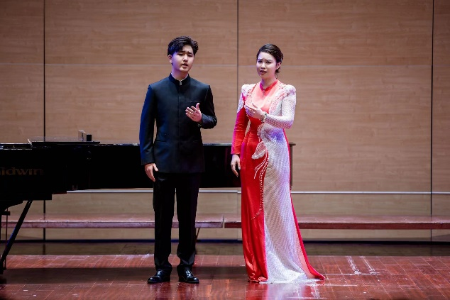 声乐专业研究李沺田独唱《西风》,本科生高远独唱《莫尼山》,两人合唱歌曲《虞美人·春花秋月何时了》歌曲由唐后主李煜作词,王龙作曲。此词为词人的绝笔,是一曲生命的哀歌,作者通过对自然永恒与人生无常的尖锐矛盾的对比,抒发了亡国后顿感生命落空的悲哀。