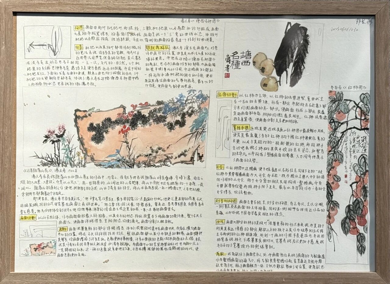 画展开幕式上,指导老师谷新春首先简要介绍展览缘起,对学院领导老师的支持与同学们的付出表示感谢,并希望同学们以此次展览为起点,既要扎根传统技法,也要保持创作热忱,让传统艺术在当代焕发生机与活力。学生代表佘思祎分享了课程收获:“从分析经典作品的空间布局,到尝试创作当代题材构图,不仅掌握了‘经营位置’的技法要点,更深刻领悟到古人反复推敲的匠心精神。”艺术学院副院长姚榕华以“打牢基础,志存高远”为核心,结合美术学科与中国画专业特色强调:“美术学科,尤其是中国画专业,既要坚守并传承传统文化精要,也要树立高远追求、向更高艺术境界迈进。”他还鼓励大家在夯实专业基础的同时,注重涵养文化素养,努力追求更高的艺术造诣。