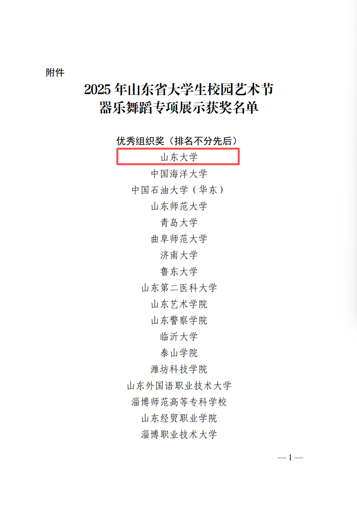 近日,由山东省教育厅主办的2025年山东省大学生校园艺术节器乐舞蹈专项展示活动获奖名单正式公布。山东大学凭借深厚的艺术积淀和精湛的表演技艺,在此次展演中获得一等奖3项、二等奖1项、优秀原创作品奖1项,山东大学获优秀组织奖。