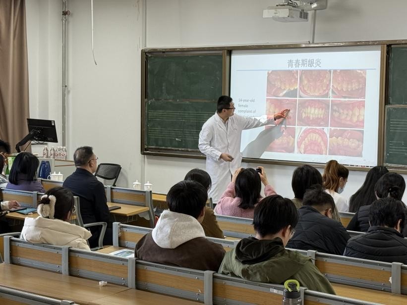 在知识宣讲环节,口腔医学院(口腔医院)的专家结合丰富的临床案例,用通俗易懂的语言系统讲解了龋齿、牙周病等常见口腔疾病的成因、危害及预防方法。同时,专家还现场演示了正确的刷牙方法、牙线使用技巧,并提醒大家要定期进行口腔检查,做到“早发现、早诊断、早治疗”。宣讲过程中,师生与医护人员积极互动,就牙齿敏感、种植牙护理等问题向专家提问,专家逐一耐心解答,现场学习氛围浓厚。