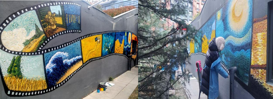 本次墙绘活动是艺术学院推动专业教学与校园服务深度融合的又一次生动体现。在活动筹备阶段,学院积极配合交通通讯中心,组建了由专业教师指导、学生主导的创作团队,全面负责设计与绘制工作。创作团队以梵高经典作品为灵感,提取《星月夜》《向日葵》《盛开的杏花》等作品中的色彩与笔触元素,融入伊朗插画师的创意设计理念,将艺术经典与现代校园生活场景有机结合。创作既延续了经典艺术的精神内涵,也兼顾了公共环境的实用与审美,让师生在潜移默化中接受艺术滋养。