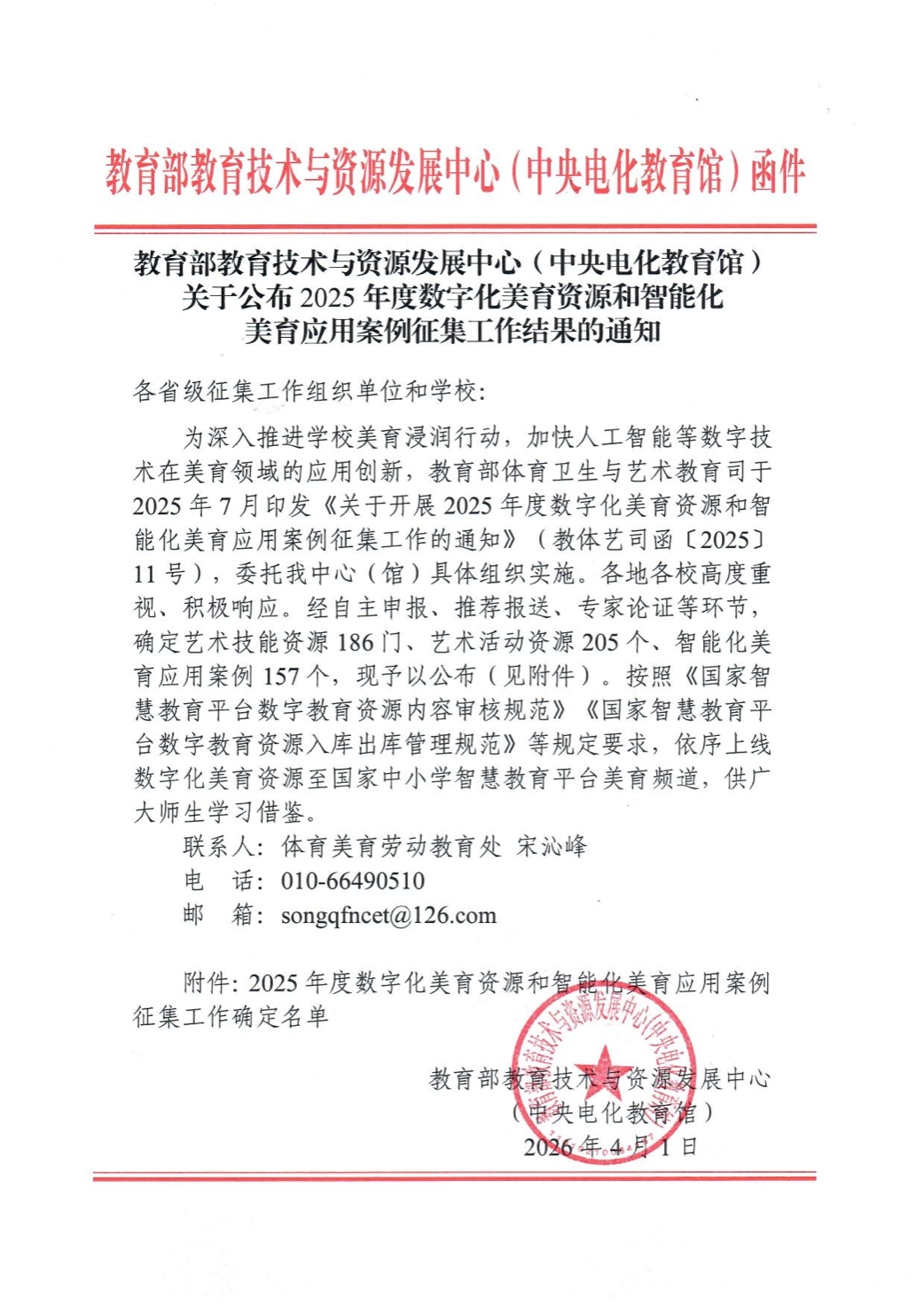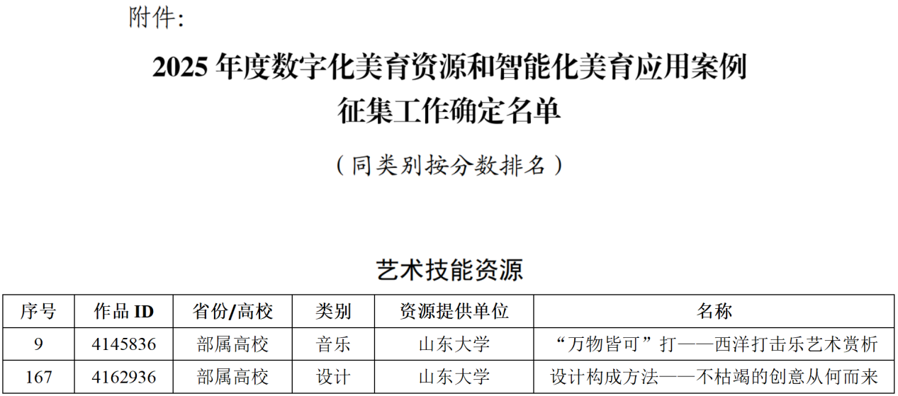 近日,教育部教育技术与资源发展中心正式印发《关于公布2025年度数字化美育资源和智能化美育应用案例征集工作结果的通知》。本次征集由教育部体育卫生与艺术教育司统一部署,经自主申报、推荐报送、专家论证等严格环节,遴选出艺术技能资源186门。山东大学共有2个项目入选。