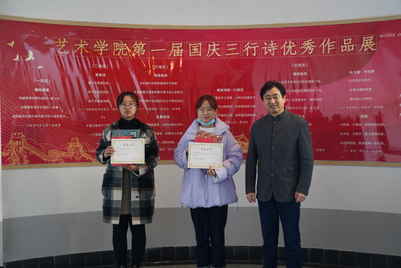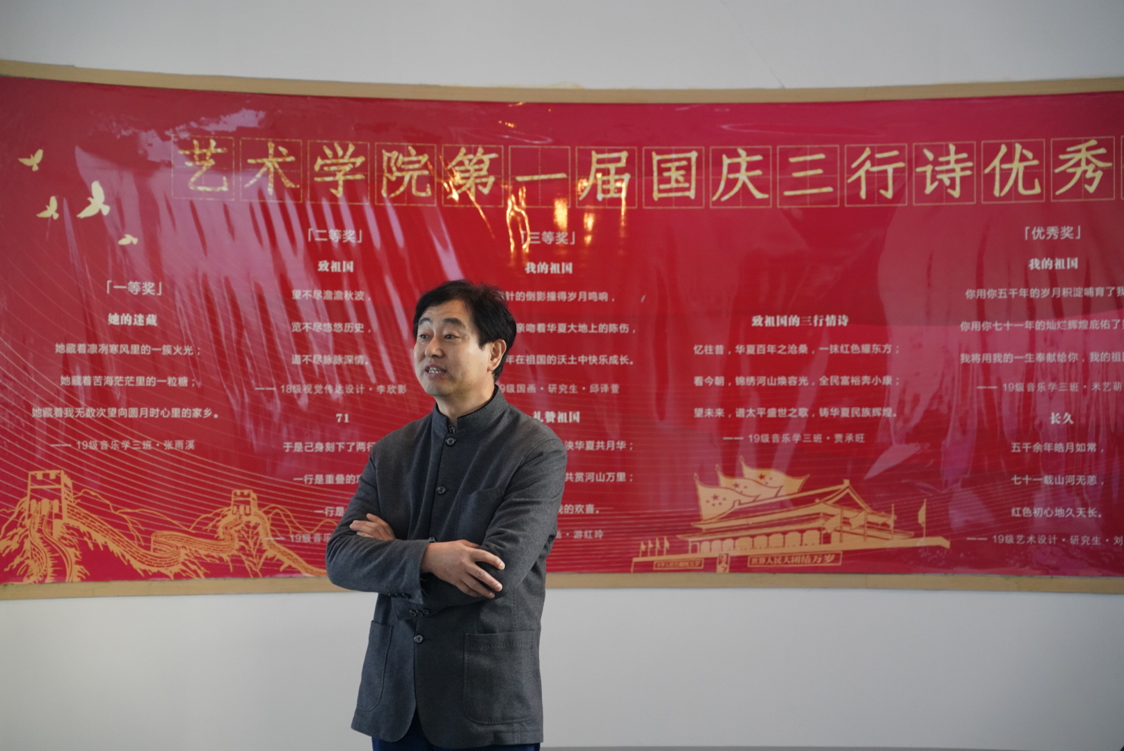 为了进一步弘扬爱国精神、激发同学们的文学创作热情,艺术学院党务管理与服务中心在国庆期间举办了第一届国庆三行诗大赛,经过一个月的作品收集和评选,评出一二三等奖和优秀奖若干。11月11日上午10时,艺术学院于三行诗优秀作品展板前召开了三行诗大赛表彰会。艺术学院院长李晓峰、党委书记李恒江、副院长张剑、副书记宗文婷、2018级辅导员邱涛出席活动,2019级辅导员董薇薇主持。