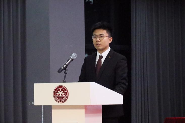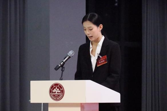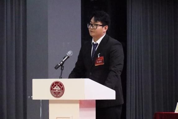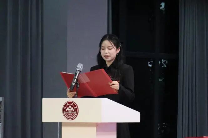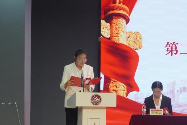 山东大学研究生会主席陈一阁受邀登台致贺词。他首先对大会的隆重召开表示热烈祝贺,高度认可艺术学院研究生会等学生组织在校园文艺精品创作及校园文化活动开展中取得的优异成绩,还特别提及学校研究生会与艺术学院研究生会长期在学术交流、美育实践等领域奠定的良好合作基础。同时,他祝愿大会圆满完成各项议程,期待未来双方进一步深化协作,共同为学校人才培养与校园文化建设贡献更大力量。