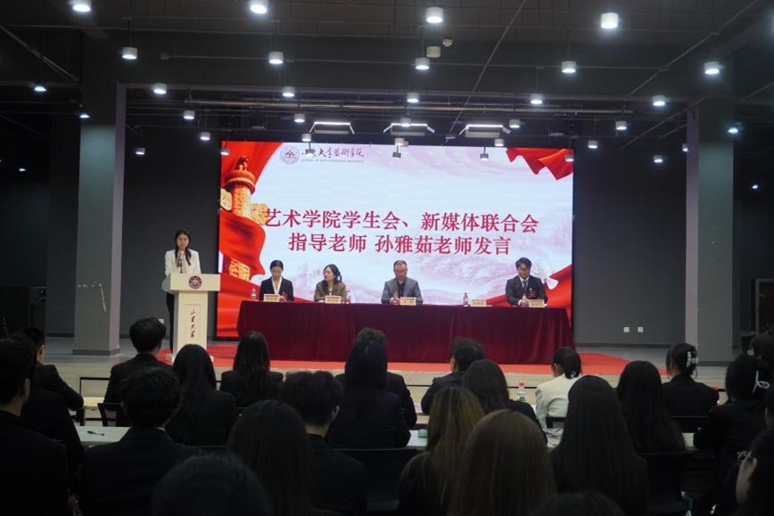 艺术学院学生会、新媒体联合会指导教师孙雅茹老师作交流发言。她充分肯定了两个学生组织过往成效,并分别提具体要求,希望学生会深化需求对接、提升服务实效,希望新媒体联合会创新内容形式、讲好艺术学院青春故事;最后,她鼓励全体成员凝心聚力,为推动学院学生工作高质量发展贡献力量。