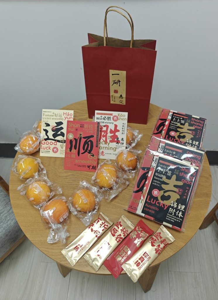 随后,毕业班辅导员老师们向每位备考考研的同学们赠送了学院老师和学生会同学们精心准备的考研加油包:金黄圆润的橙子寓意“心想事橙”,愿学子们笔下生辉、梦想成真,“金榜题名”糖果包裹着甜蜜的祝福,那支“乘愿而归”的笔,则是“以笔为剑、斩棘前行”的期许。这份温暖的心意传递着老师和同学们对22级全体考研同学的鼓励与祝福,也让考研学子们感受到了艺术学院大家庭的温暖与关怀。