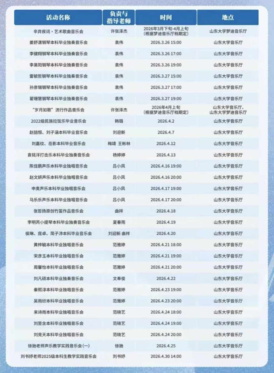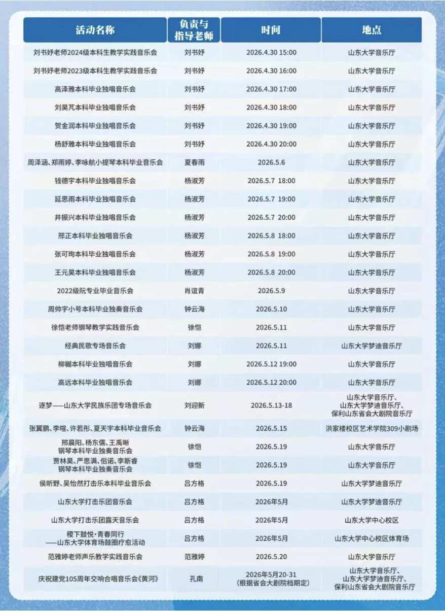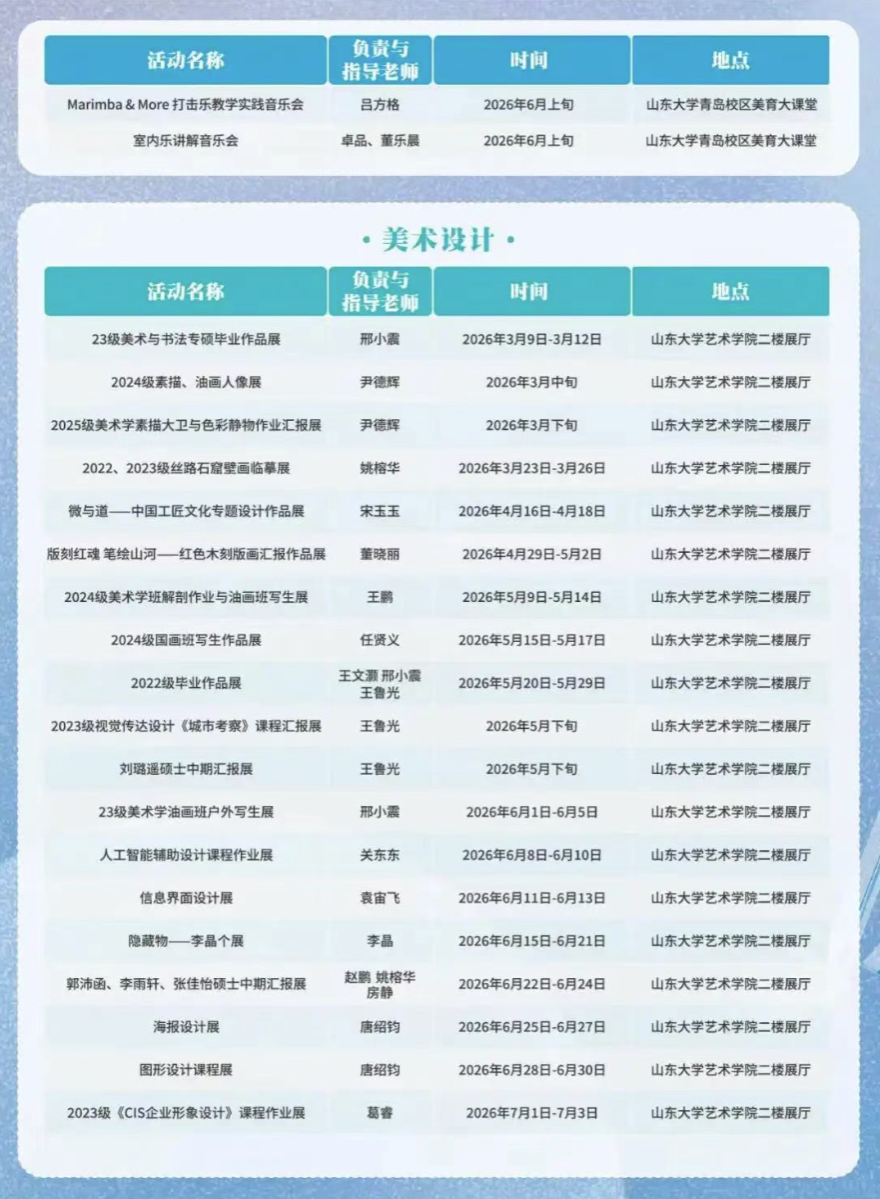 本届艺术展演季既是山东大学艺术学院教学成果的集中展示,也是学院以美育人、以文化人的生动实践。多样的艺术形式、丰富的展演内容,既为学子搭建了锤炼专业能力、展现艺术风采的实践平台,也让艺术之美浸润校园,持续丰富校园文化生态,助力师生在审美熏陶中涵养人文情怀、提升艺术素养。